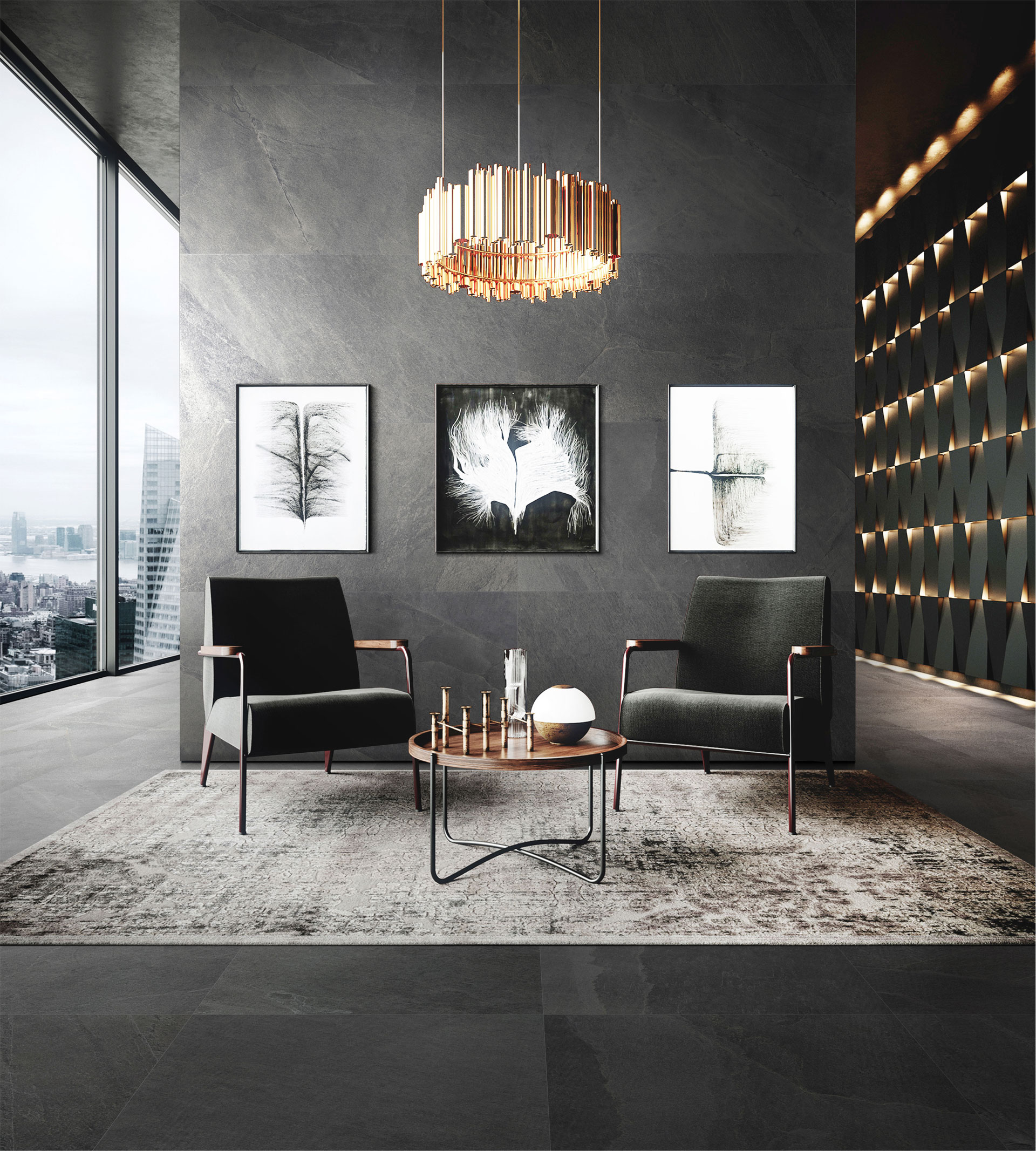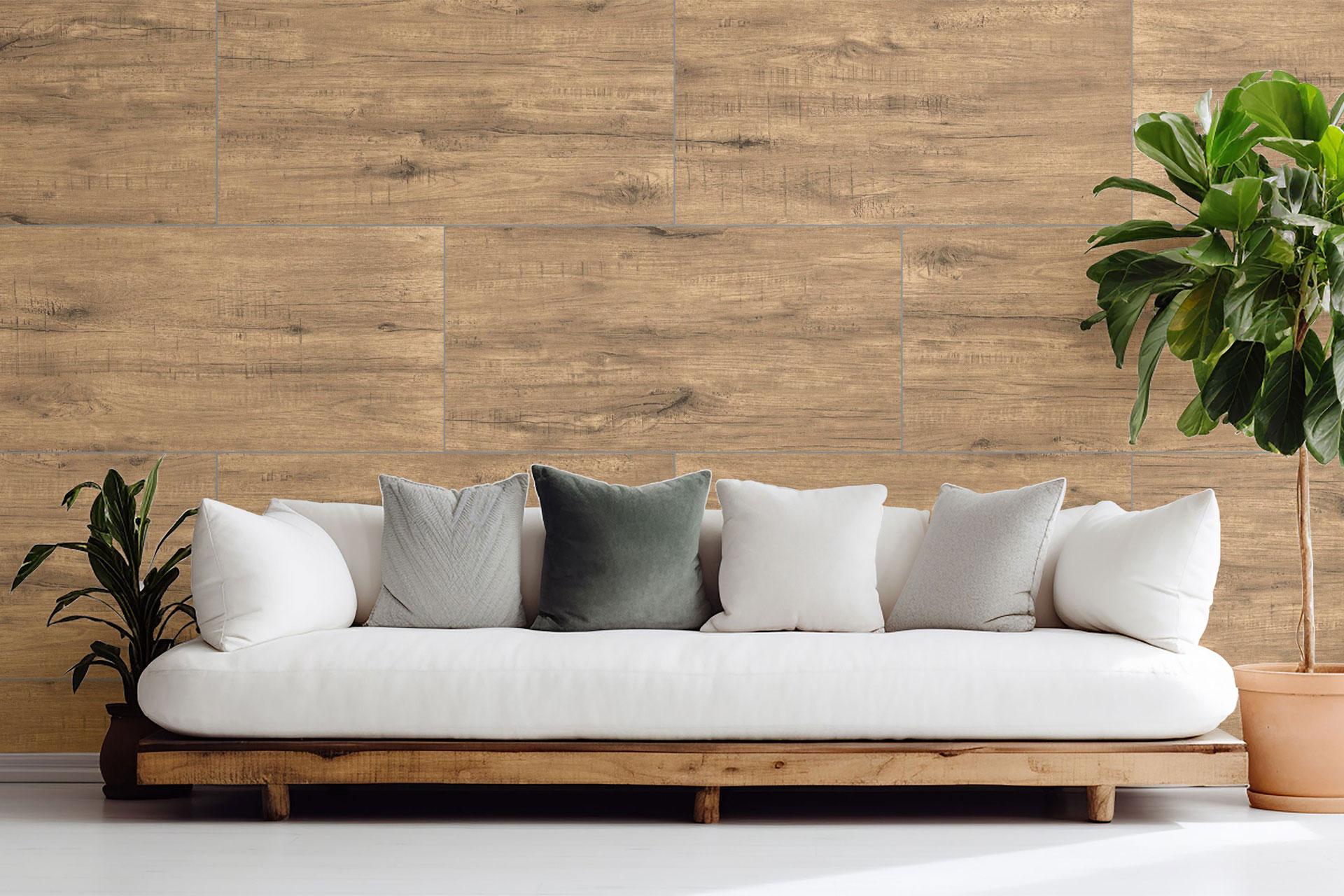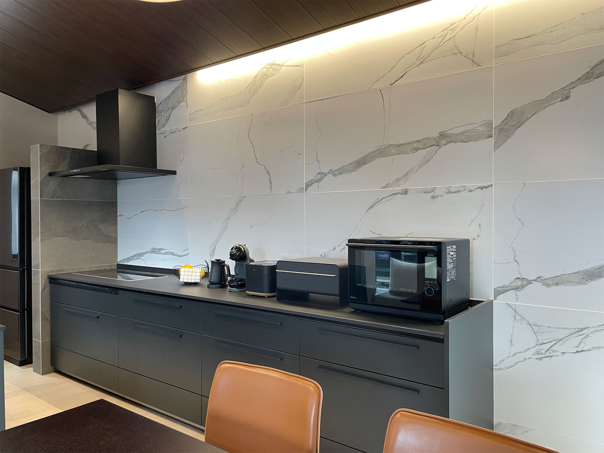 意匠性豊かな本物のセラミックタイルでありながらも薄型ミドルサイズ仕様(4.8~6mm厚の1200×600サイズ)なので、一人でも持てる軽さで壁への負担も軽減できます。