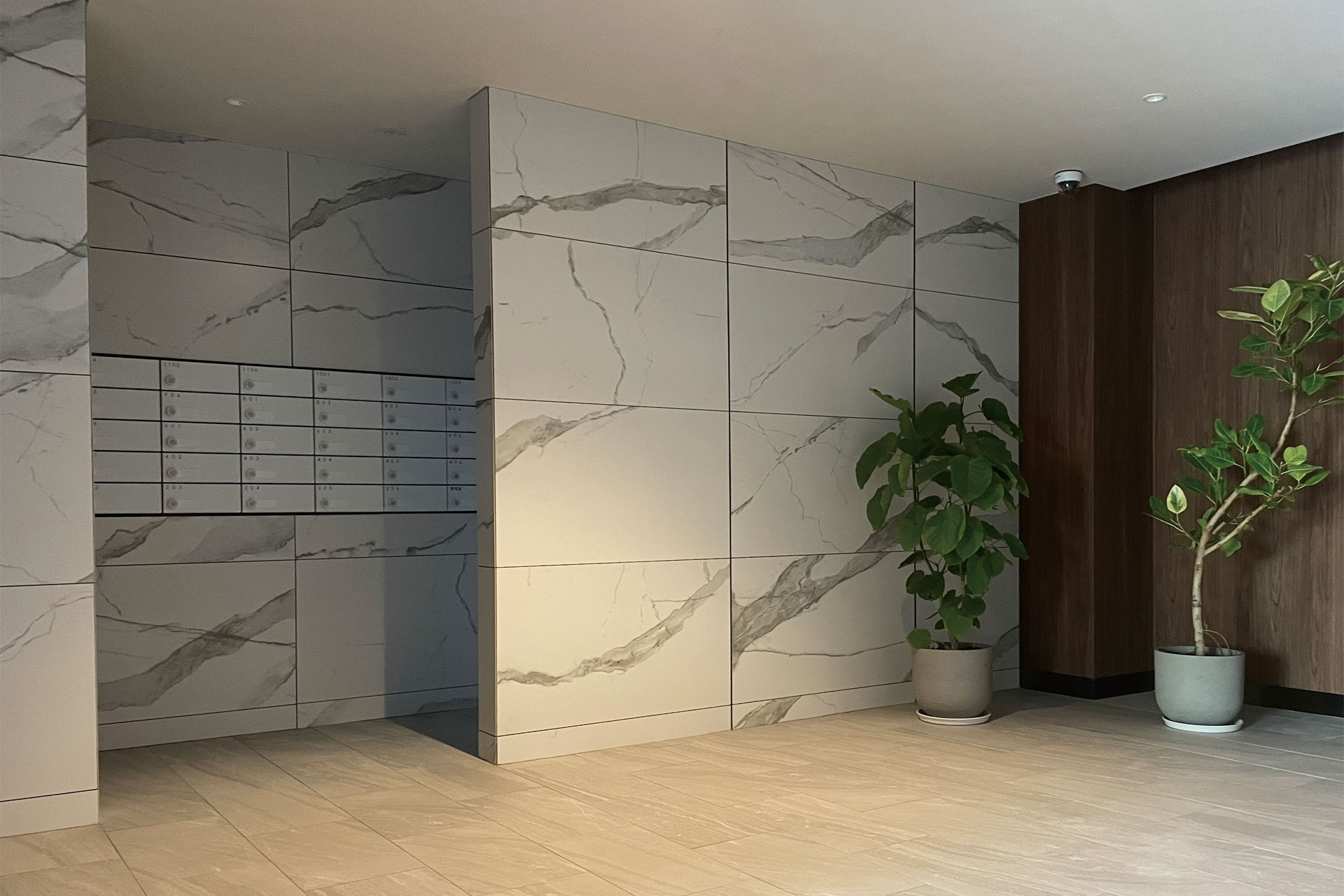 従来タイルの採用が難しかった壁面への施工も、大判でありながら軽く、一人でも持ち運びができるため、内装・外装を問わず施工効率を高め、㎡荷重~15㎏/㎡を実現している為、作業負担と躯体への影響を軽減します。